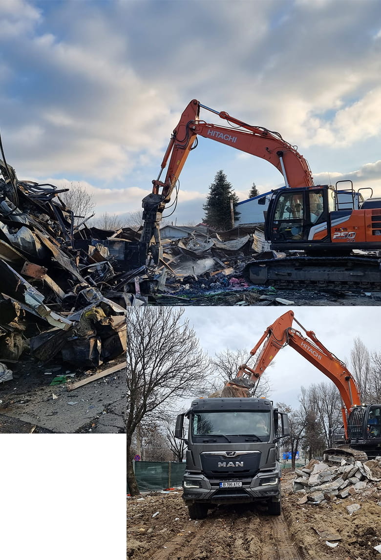 Flotă proprie de excavatoare și buldoexcavatoare pentru lucrări eficiente de demolare și terasamente.